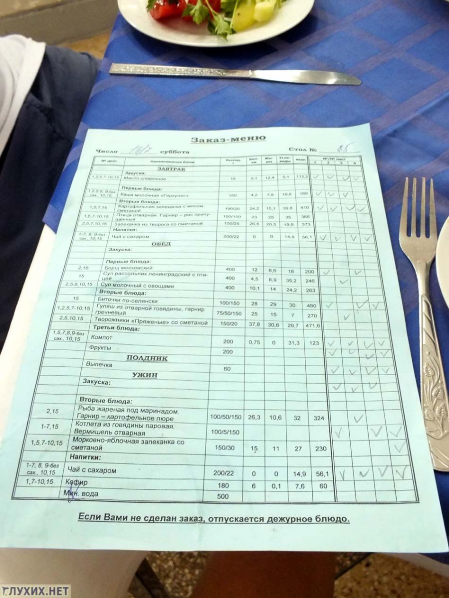 А насчет меню… Да, конечно, ассортимент блюд не так разнообразен, как хотелось бы (некоторые блюда повторяются; ну да, ведь мы не только за едой ездили в санаторий). Выбор есть. Вкусно и сытно, никаких тебе червячков и волос. Из трех блюд можно выбрать понравившееся, поставив в меню (в колонке справа) галочку.