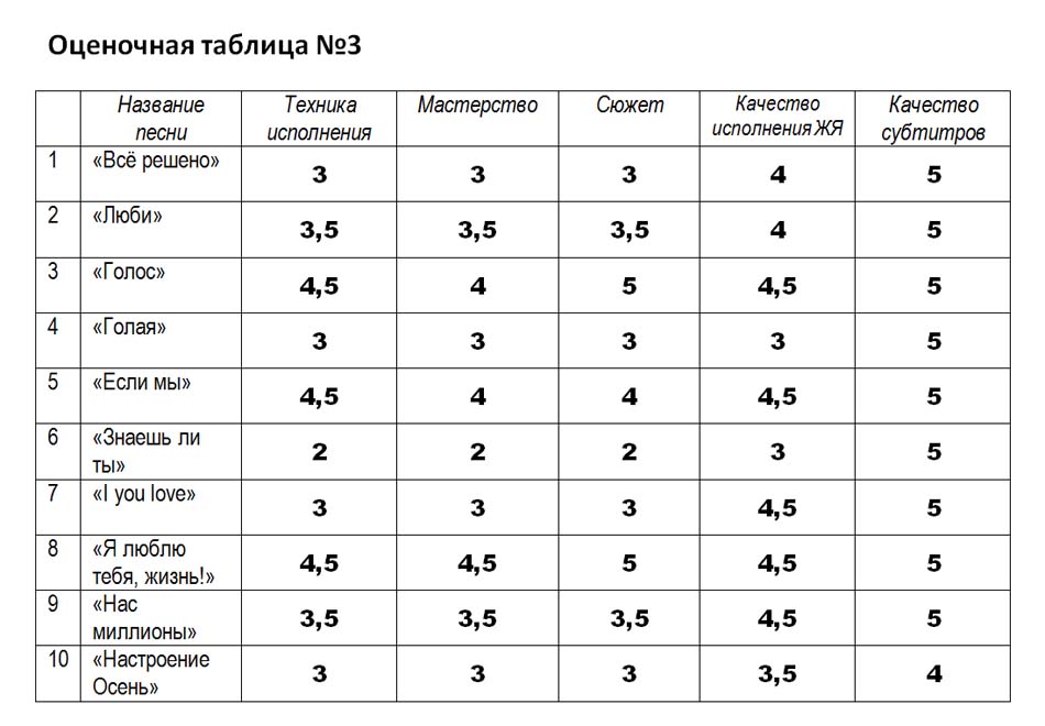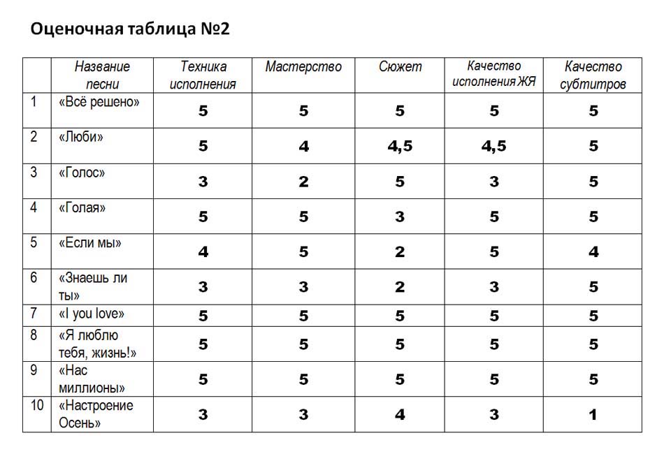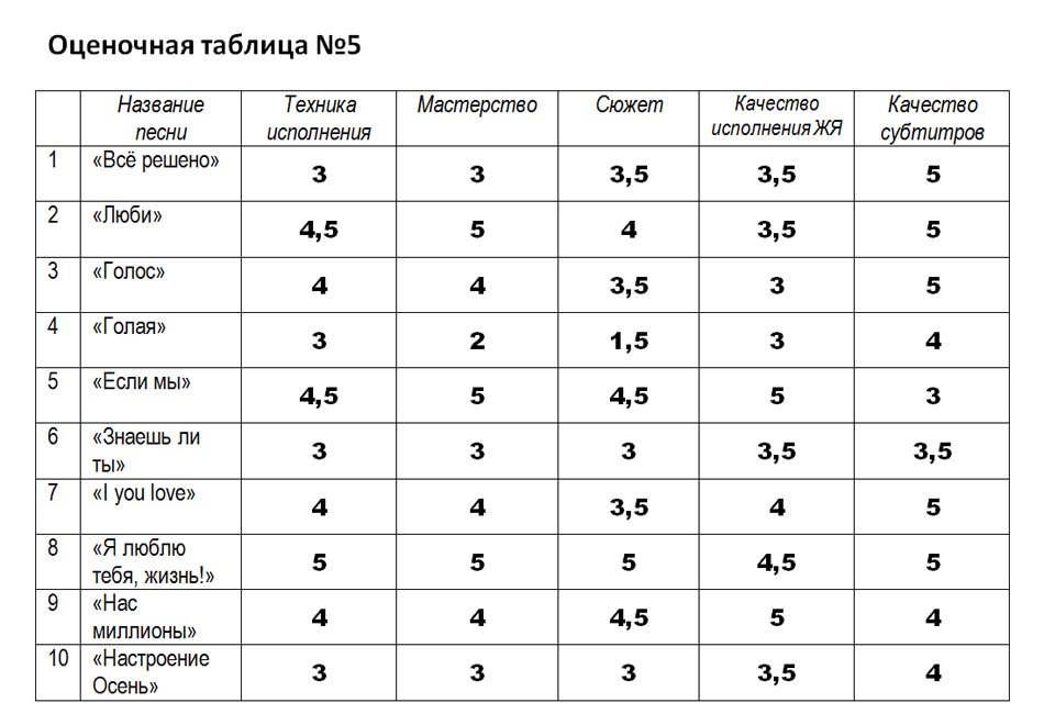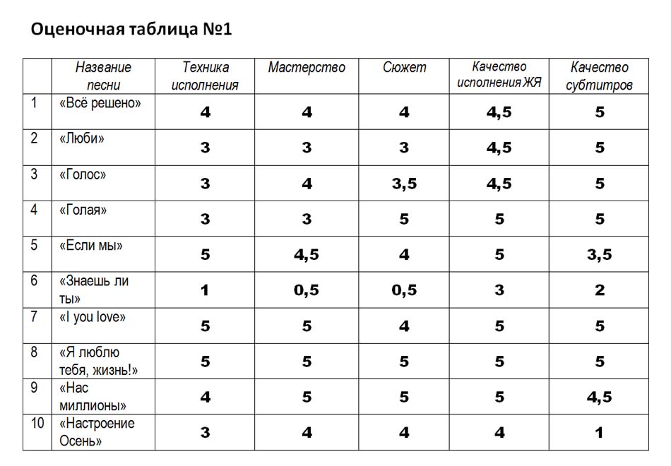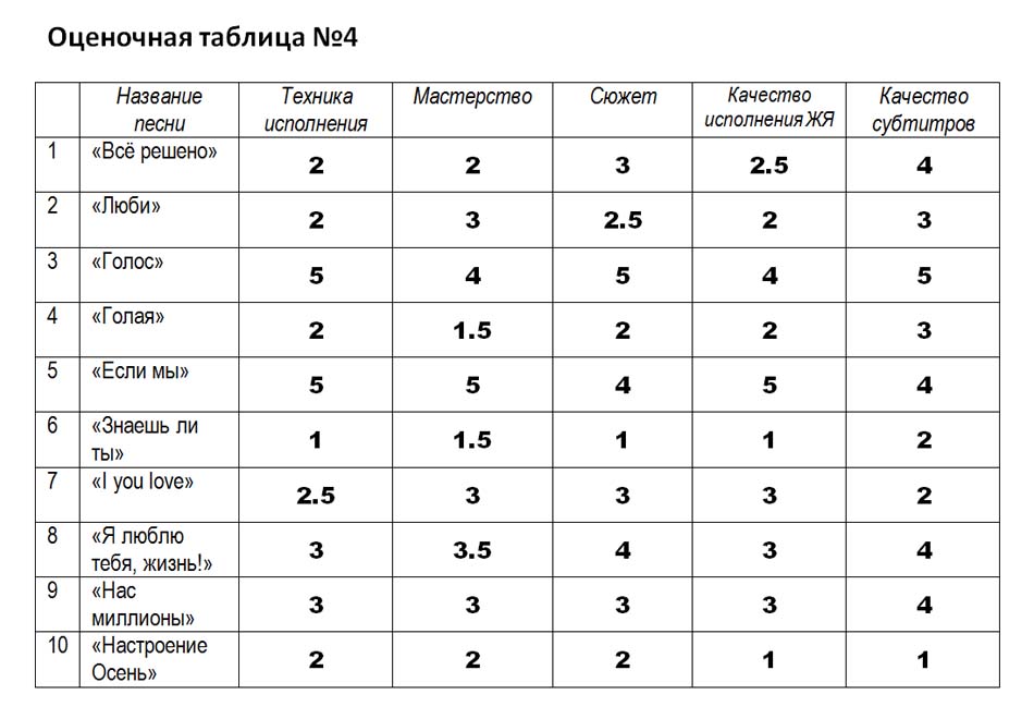 Все члены жюри внимательно изучили видеоклипы и оценили их оценками по 5-балльной шкале. Все их результаты мы обобщили и пришли к следующим результатам: