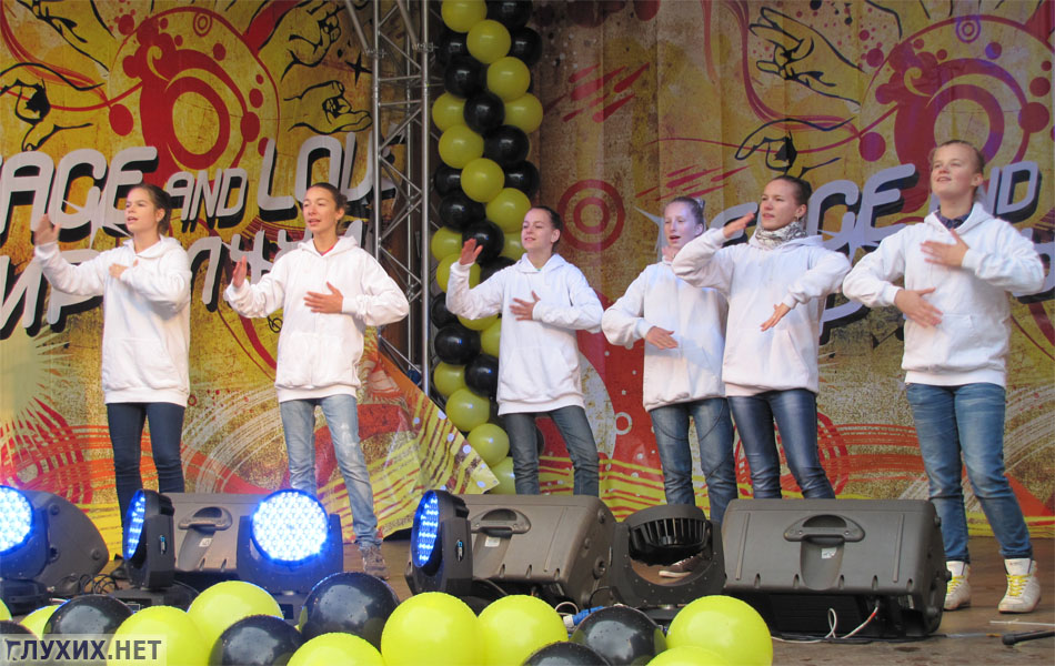 праздничный концерт. В первой части выступили учащиеся специализированных школ и других учебных заведений для детей с ограничениями по слуху. Они показали танцевальные постановки, пантомиму, сценки и песни на жестовом языке.