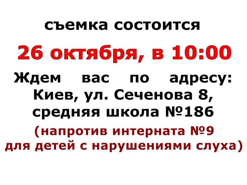 Этот адрес электронной почты защищён от спам-ботов. У вас должен быть включен JavaScript для просмотра. Съемка состоится в субботу 26 октября и будет проходить с утра до вечера. Начало в 10:00. Место съёмок: Украина, Киев, ул. Сеченова, 8, средняя школа № 186. Онлайн-регистрация участников заканчивается 25 октября вечером.