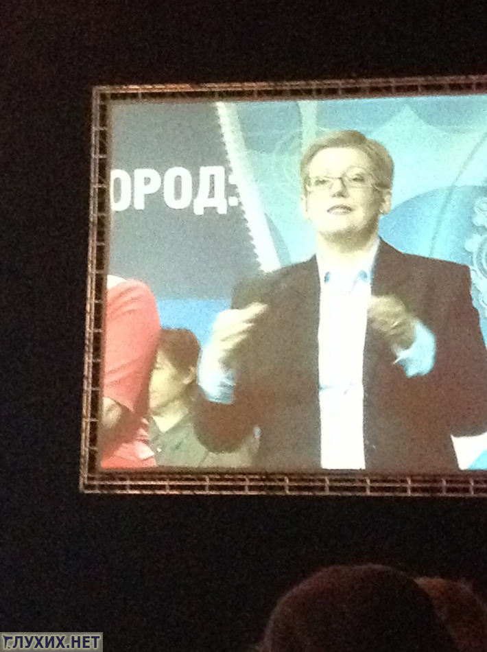 На экране слева от Варвары виден пустой участок сцены, а справа от Варвары виден фрагмент алого изгиба платья с изящным локотком ведущей или фрагмент ее прически. Иногда, когда по сцене ходят люди (если повезет – в непосредственной близости от сурдопереводчиц Варвары или Ирины), то позади сурдопереводчика видны еще и фрагменты пиджаков, шей, плеч…