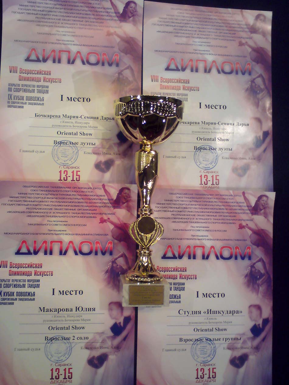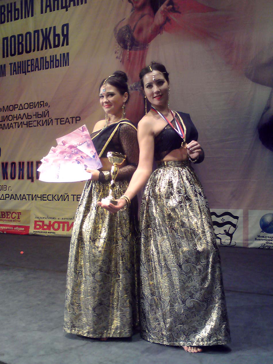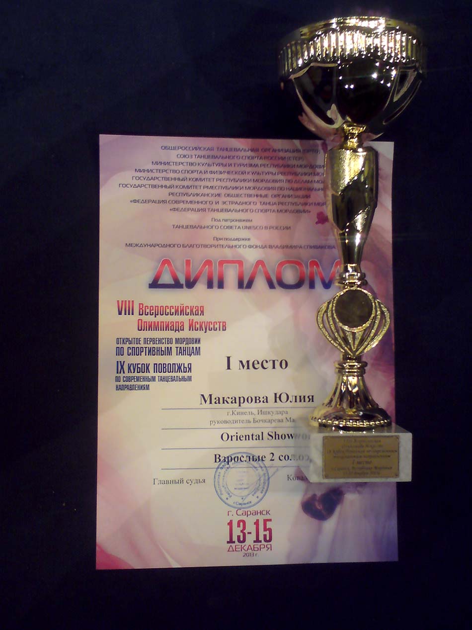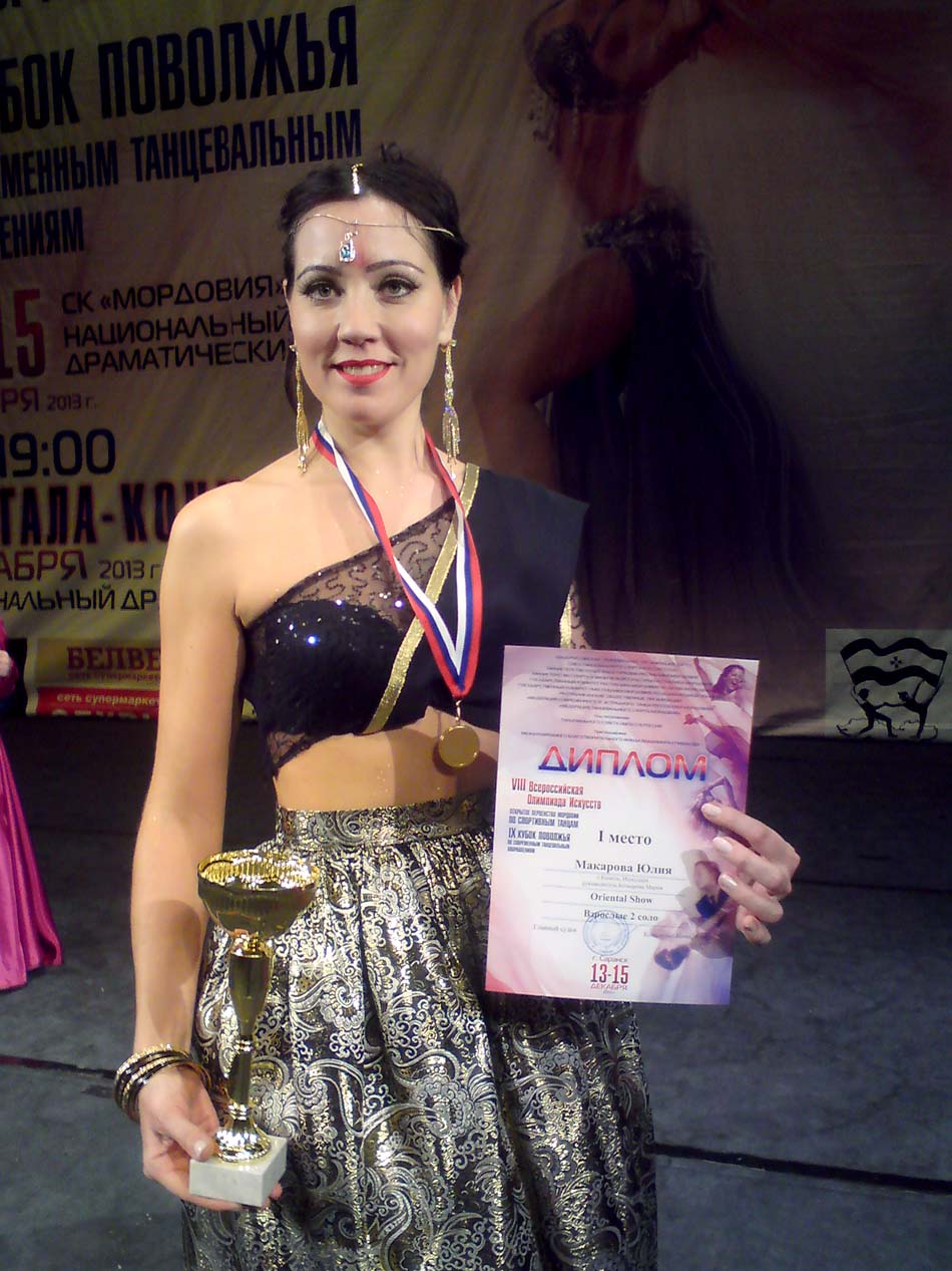 На этот раз Юлия Макарова приехала к нам в Саранск в составе слышащего коллектива «ИШКУДАРА» под руководством Марии Александровны Бочкарёвой, которая привезла три ярких номера в номинации – соло, дуэт, группа. Во всех своих выступлениях ее танцевальная студия одержала убедительную и безоговорочную победу среди других взрослых коллективов, по праву выиграв Кубок и золотые медали «Олимпиады Искусств» в номинации «Индийские танцы».
