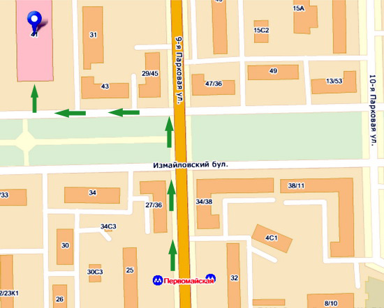 Идти по 9-й Парковой ул., до пересечения с Измайловским бульваром.