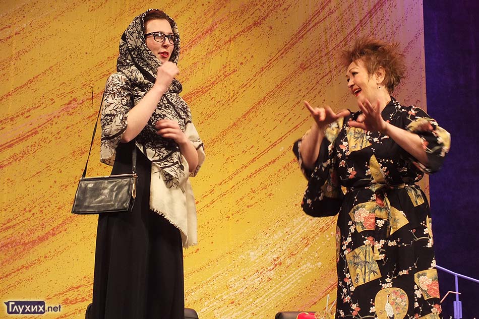 Два мужика (С. Родин и Р. Фомин), наперебой объясняли всем со сцены, чем же Женщина отличается от некоторых предметов, и почему она лучше, чем эти вещи.