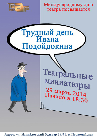 Театр Мимики и Жеста приглашает вас на театрализованное представление, посвященное Международному дню театра. Глухой человек Иван Подойдокин, уходя из дома по своим делам, сталкивается с проблемами, знакомыми каждому глухому человеку. И теперь вы увидите узнаваемые ситуации в своей жизни на сцене театра. Начало 29 марта в 18.30. Билеты можно приобрести через официальный сайт ТМЖ.