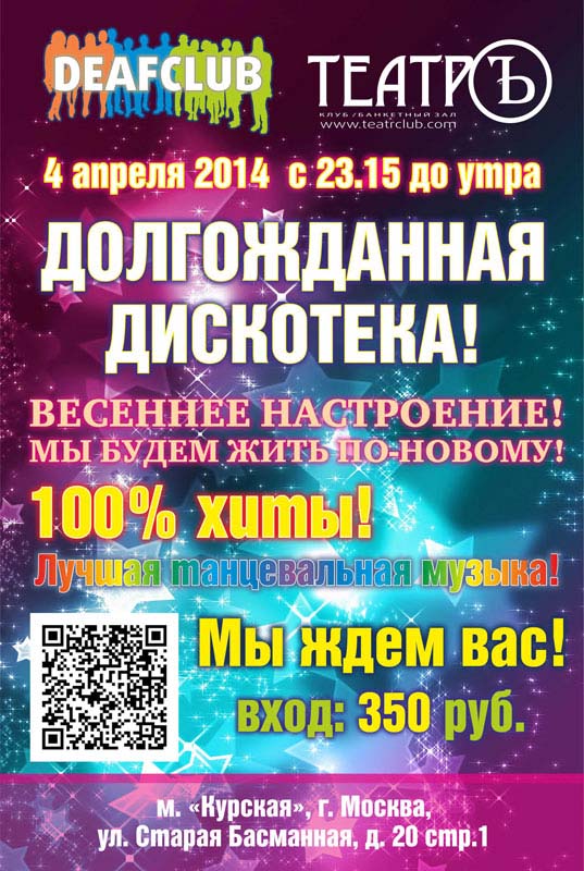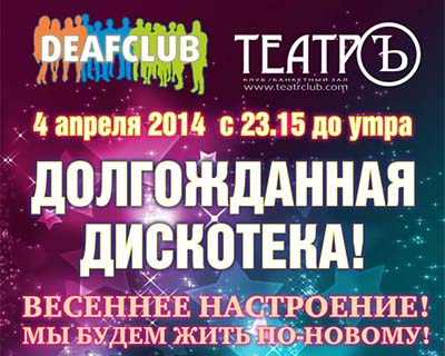 Театръ» состоится долгожданная весенняя дискотека от Шевы для глухих, слабслышащих и всех. Организаторы гарантируют прекрасное настроение, лучшую танцевальную музыку и заряд позитива на все выходные.