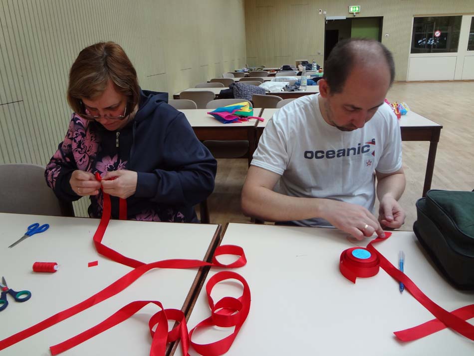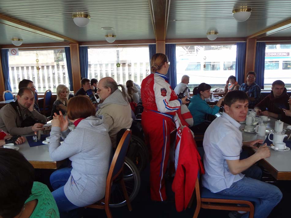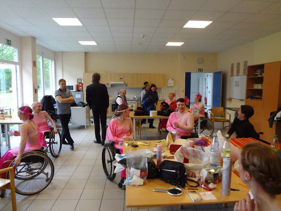 С 6 мая у нас начались по утрам репетиции в огромном танцспортхолле спорткомплекса с зеркалами на одной стене. «Нам бы такой зал!» – сказала артистическая часть нашей делегации. Там же на репетиции мы встретились с творческим коллективом немцев – ансамбль из 5 колясочников и 5 человек на ногах. Коллектив существует всего пару месяцев, но концертные номера уже есть. Стоит отметить, что ограничения по здоровью у всех разные и немецкий «колясочный» состав в разы отличается от нашего «Гротеска» – там люди с более тяжелыми формами недуга, не только опорного-двигательного характера, но и умственного. Немецкий коллектив очень доброжелательно нас встретил: мы показали друг другу некоторые свои концертные номера, пообщались и попрощавшись, немецкий состав удалился и дал нам возможность «прогнать»свои концертные номера, не отвлекаясь на беседы. Три дня нам была дана возможность по утрам репетировать и готовится к фестивалю.