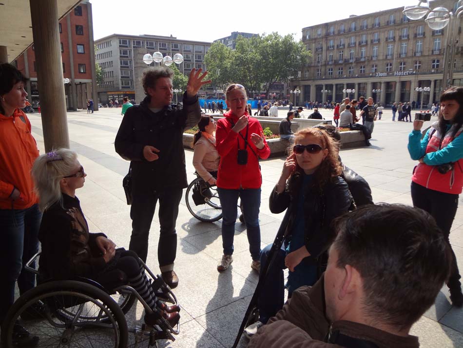 В 10 ч. нас уже ждали автобусы (на протяжении всех дней с нами были веселые водители и 4 автобуса с подъемниками для колясок), на которых мы отправились в центр Дуйсбурга. И сразу нас привезли в магазин, в котором выставлена продукция, которую изготавливают инвалиды в мастерских Дуйсбурга (Duisburger Werkstatt für Menschen mit Behinderung gemeinnützige GmbH). Мы пообщались с работниками магазина, посмотрели ассортимент товаров и отправились прогуляться на центральную улицу Дуйсбурга, где расположено множество кафе, бутиков и торговых точек.
