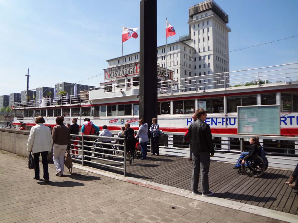 5 мая мы отправились на прогулку в порт Дуйсбурга, где совершили двухчасовой круиз по Рейну. Помимо нас на пароходе отдыхали туристы. Это были пенсионеры. Скажу сразу – пенсионеры их заметно отличаются от наших: такие модные бабульки и дедульки, в ярких одеждах и в черных очках, в браслетах и в шляпках....Впечатляет!
