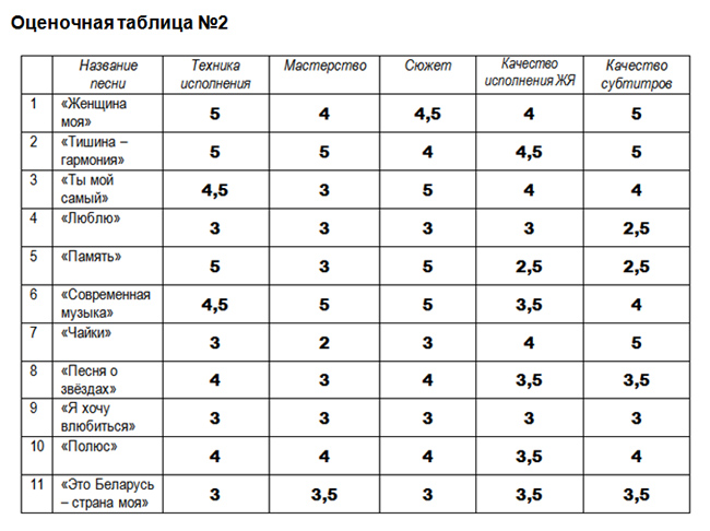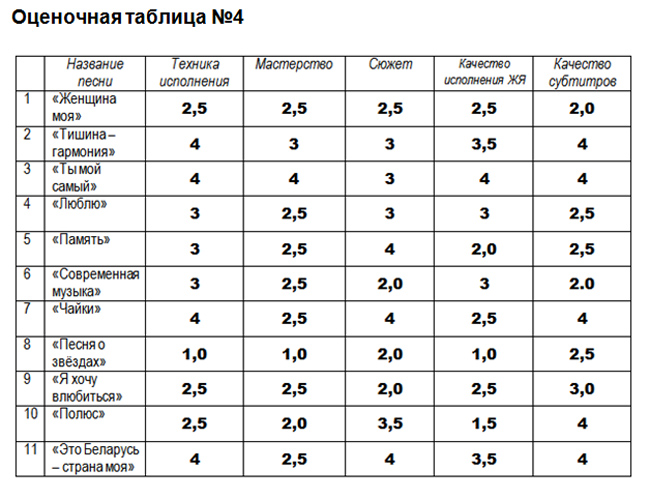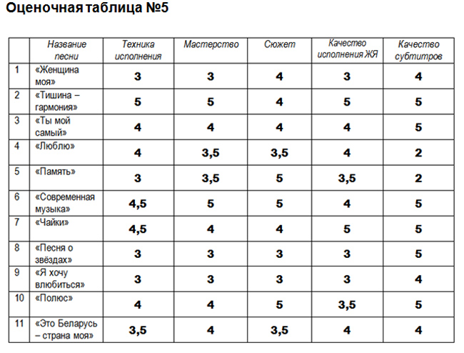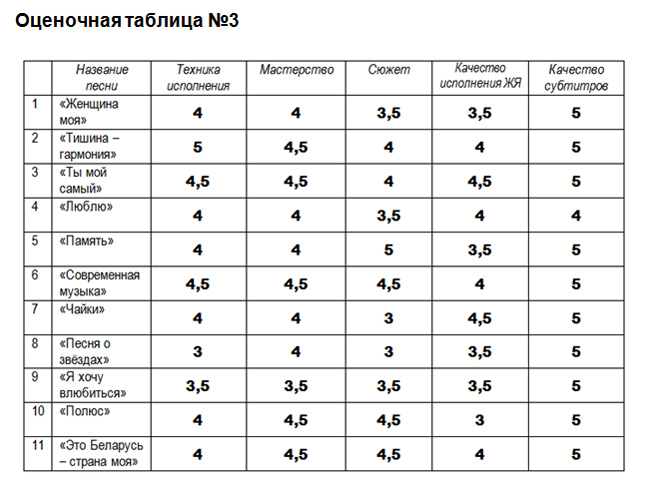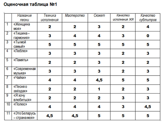 Все члены жюри внимательно изучили видеоклипы и оценили их оценками по 5-балльной шкале. Все их результаты мы обобщили и пришли к следующим результатам: