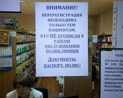 То, что творится в московских поликлиниках, иначе, как безалаберностью медицинских чиновников не назовешь. Чего там здоровье граждан, главное получить бумажки до 1 декабря и успеть получить деньги. Но чиновники потом, видимо, поняли, что перестарались и смягчили условия «игры». На днях руководитель Департамента здравоохранения Алексей Хрипун в интервью СМИ коснулся вопроса прикрепления граждан к городским поликлиникам, заявив, что москвичам не будут отказывать в бесплатном обслуживании, если они не успеют прикрепиться к поликлинике до 1 декабря, подчеркнув, что просьба прикрепиться к поликлинике до начала зимы является просто напоминанием.