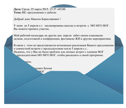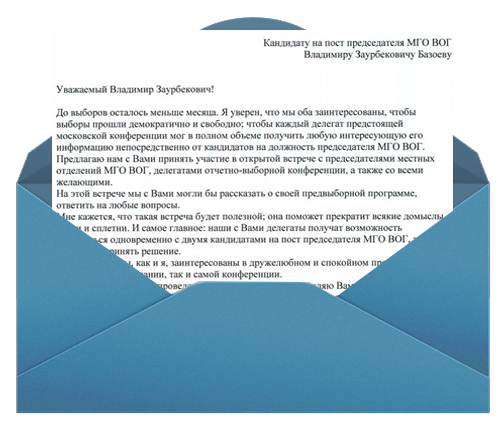 До выборов осталось меньше месяца. Я уверен, что мы оба заинтересованы, чтобы выборы прошли демократично и свободно; чтобы каждый делегат предстоящей московской конференции мог в полном объеме получить любую интересующую его информацию непосредственно от кандидатов на должность председателя МГО ВОГ.