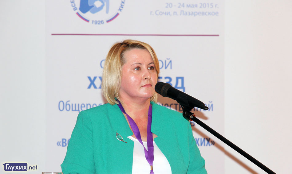 Людмила Юрьевна Вакорина, заместитель начальника отдела образования детей с проблемами развития и социализации Департамента государственной политики в сфере защиты прав детей Минобрнауки России, говорила о взаимодействии Минобрнауки России и ВОГ в области образования глухих и слабослышащих, какие есть проблемы и перспективы совместной работы.