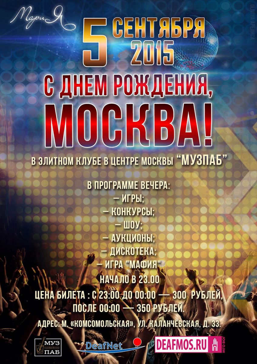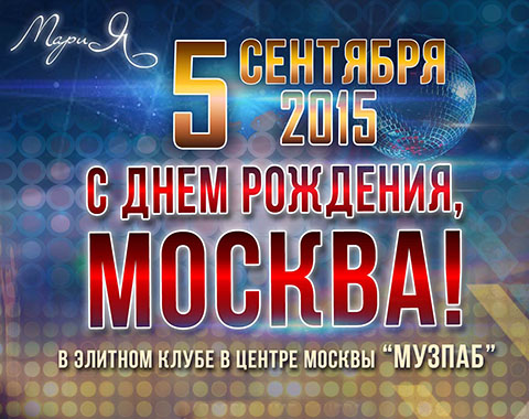 5 сентября (суббота) – Москва будет праздновать свой день рождения! Компания «МариЯ» с радостью примет участие в праздничных торжествах, организовав дискотеку в клубе «МУЗПАБ» по адресу: м. «Комсомольская», ул. Каланчёвская, д. 33.