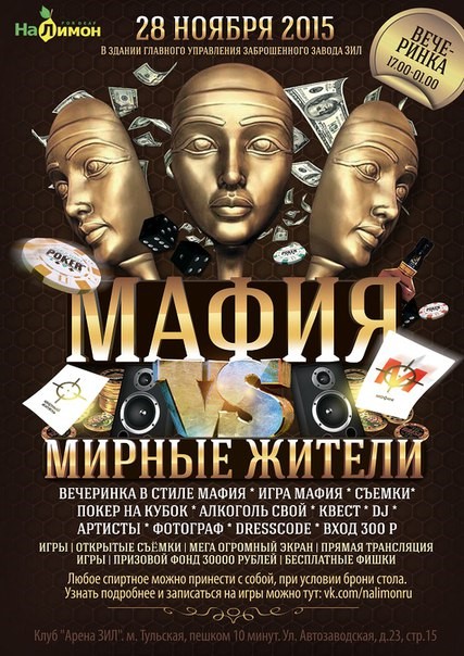 28 ноября 2015 года с 17:00 до 00:00 в здании главного управления заброшенного завода ЗИЛ состоится вечеринка в стиле «Мафия».