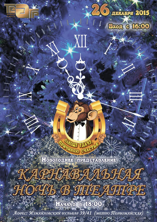 26 декабря в 18:00, в Театре Мимики и Жеста пройдёт театрализованное представление «Карнавальная ночь в театре». О чём же представление? Инициативная группа, которая занимается подготовкой новогоднего вечера, пытается сделать всё, чтобы праздник получился весёлым.