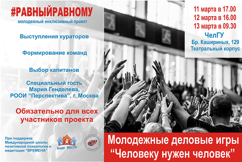 Напомним, что молодежный инклюзивный проект «Равный равному», проект Клуба «Наше место», направлен на студентов учебных заведений города, волонтеров и молодых людей с инвалидностью. В ближайшие выходные, с 11 по 13 марта состоятся Молодежные деловые игры «Человеку нужен человек», обязательные для всех участников проекта.