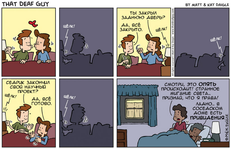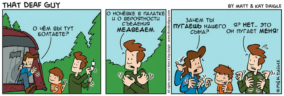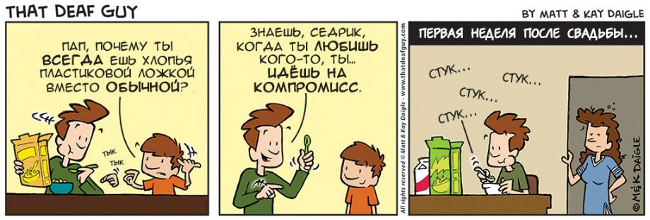 Мэтт Дэйгл и его жена Кей. Комиксы – самый удобный для художника способ рассказывать о своей жизни, и Мэтт им вовсю пользуется. Эпизоды «Глухого парня» наполнены то мягким юмором, то едким сарказмом, а иногда просто любезно утоляют неделикатную любознательность слышащих. Мы публикуем полную подборку из 40 картинок. Набираемся терпения и читаем!