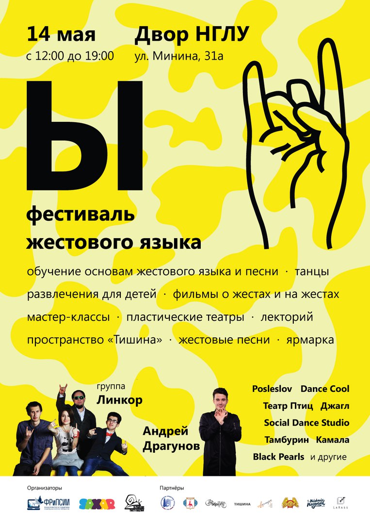 14 мая на территории НГЛУ им. Добролюбова пройдёт фестиваль русского жестового языка «Ы». Организатором выступает