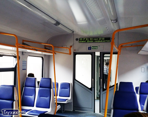 «Глухих.нет» случайно обнаружили в одной из электричек работающее табло с объявлением остановок. Одна из таких электричек ходит по Киевскому направлению. Неизвестно, как скоро заработает «бегущая строка» в остальных электропоездах.