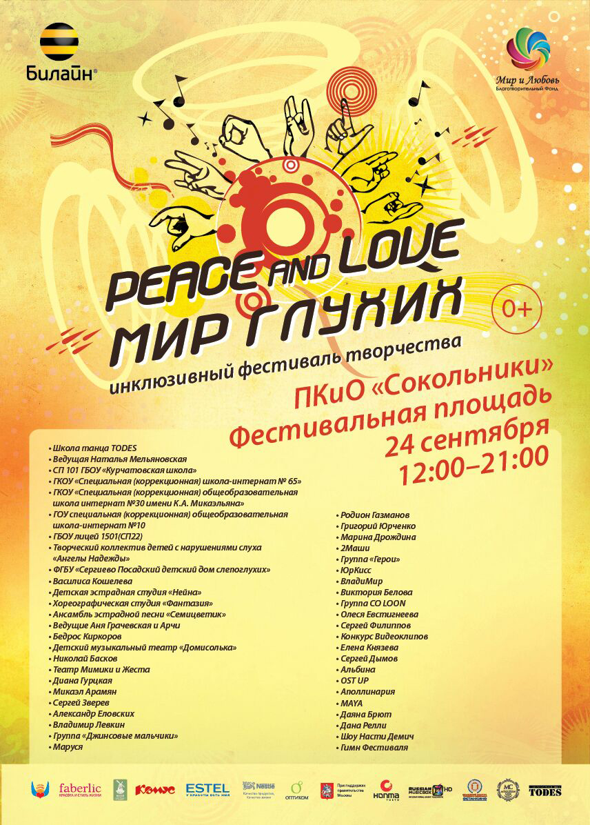 Известные звёзды российской эстрады приглашают москвичей и гостей столицы на крупный праздник «Peace and Love: Мир глухих»! Праздник состоится 24 сентября с 12:00 в преддверии Международного дня глухих при поддержке Правительства Москвы.
