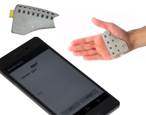 Устройство крепится на внутренней стороне ладони и с помощью встроенных сенсоров распознает жесты – 32 буквы дактильного алфавита. Полученные данные обрабатываются программной нейросетью и выводятся на смартфон в виде слов и предложений. Браслет- переводчик может работать до 12 часов без подзарядки, оснащен Bluetooth-модулем для связи с приложением на базе Android.