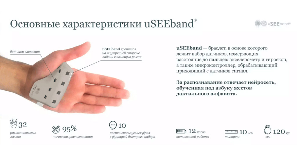 uSEEband переводит систему жестов дактильного алфавита в текст и отображает его на смартфоне или планшете в режиме реального времени. Устройство, разработанное при участии Теплицы социальных технологий, рассчитано на людей с инвалидностью по слуху и зрению и обеспечивает возможность свободно общаться с теми, кто не знает жестовый язык, – пишет сайт