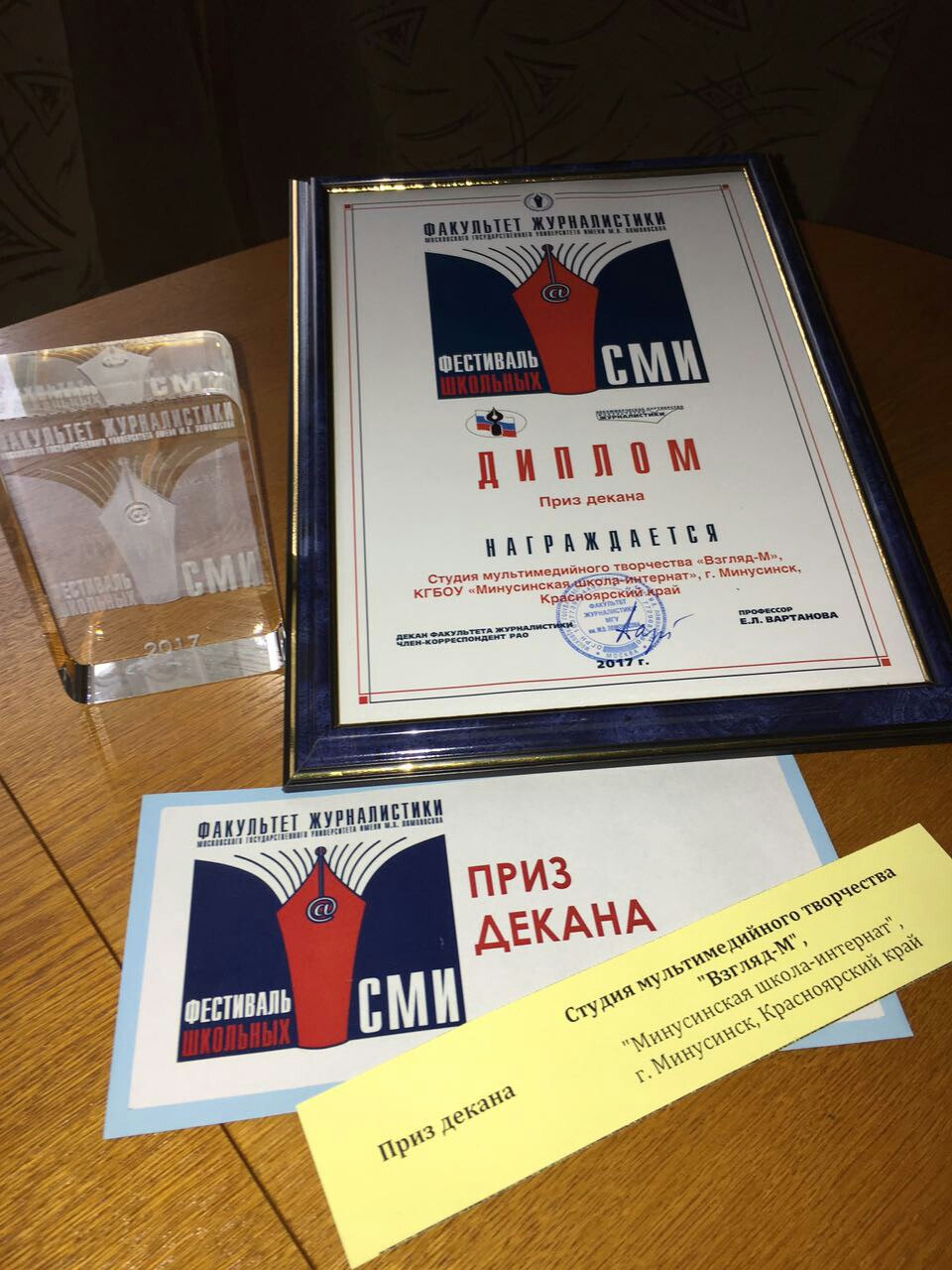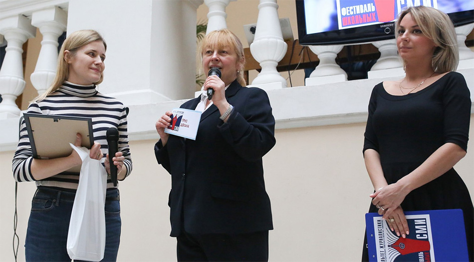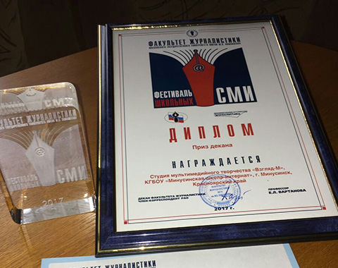 Диплом Лауреата вручала лично профессор Елена Леонидовна Вартанова – декан факультета журналистики МГУ им. Ломоносова. В номинации «Лучший телепроект» было зарегистрировано 64 школьных СМИ со всей России. Жюри (журналисты, профессора МГУ) просмотрели три последних передачи и написали сообщение в школу: «Наш декан и жюри конкурса были очень восхищены работой вашей студии».