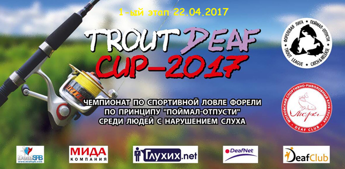 22 апреля 2017 года МСРКГ (Московский Спортивно-Рыболовный Клуб Глухих) совместно с Форелевой Лигой будут проводить 1-ый Рейтинговый этап Чемпионата Форелевой лиги по спортивной ловле прудовой форели по принципу «Поймал-Отпусти» на Кубок «Trout Deaf Cup 2017» среди людей с нарушением слуха на пруду зоостанции Московской с.-х. академии им. К. А. Тимирязева. Лимит участников ограничен в 30 чел. Взнос составит 1000 руб с участника. (Подробности в Положении по ссылке). Генеральным спонсором Чемпионата будет Рыболовная компания МИДА.