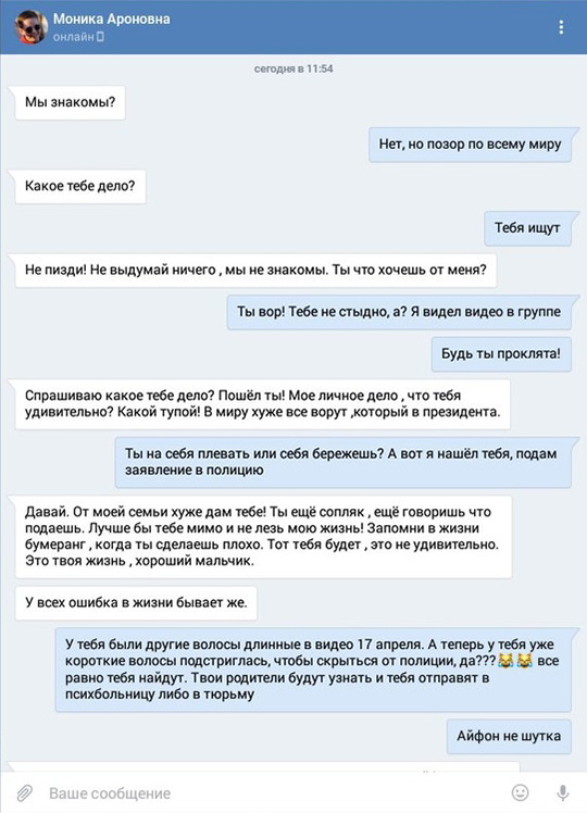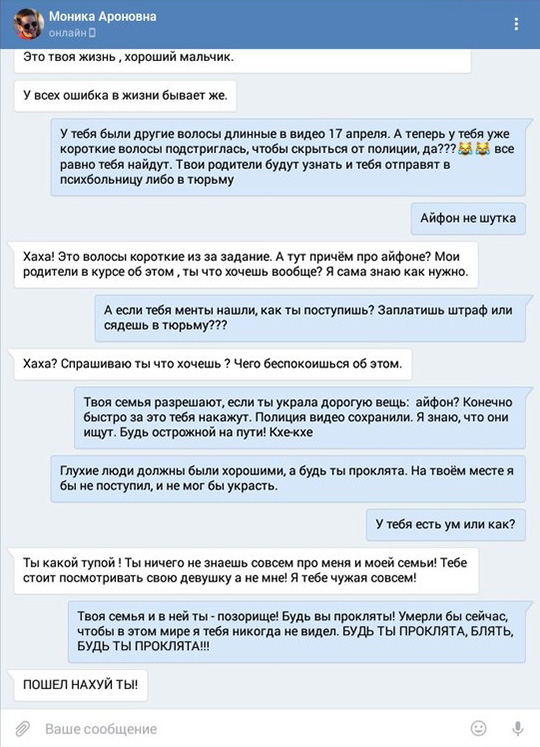 Кроме того, в сеть попала переписка с одной из участниц преступления. Один из пользователей социальной сети «ВКонтакте» отправил девушке сообщение, пристыдив её: «Позор всему миру»! И далее завязывается словесная перепалка с использованием грубых слов. Скриншоты переписки можно посмотреть ниже на сайте «Глухих.нет»: