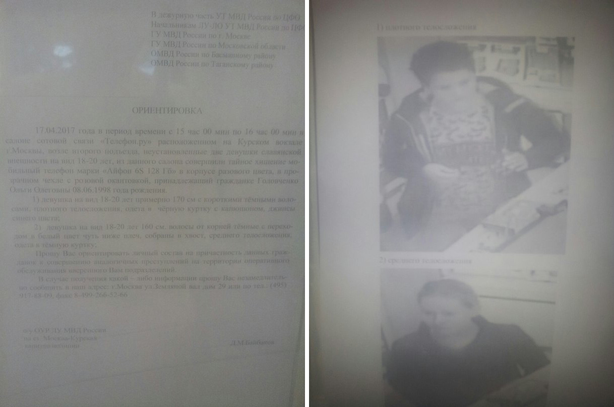 Как стало известно «Глухих.нет», две неслышащие девушки зашли в салон связи «Телефон.ру» на Курском вокзале и украли телефон «Айфон 6S 128 Гб», принадлежащий продавцу. Как следует из записи с камеры наблюдения, девушки, заходя в магазин, активно жестикулировали, и одна из них написала