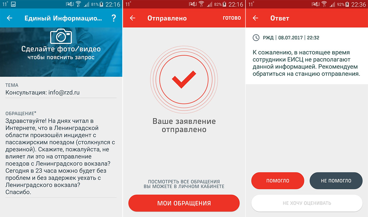 В приложении можно отправить запрос по разным темам: «Дальнее следование», «Пригородные поезда», «Вокзалы», «Пассажирские обустройства» и др. Если, к примеру, в поезде «Москва – Воркута» не понравилось обслуживание или плохо покормили, можно отправить запрос через соответствующие темы. Это всё понятно, и всё здорово! Но нас прежде всего интересует оперативное получение информации. Для примера, мы решили задать вопрос в Единый информационно-сервисный центр через мобильное приложение – ну совсем простой вопрос: «Есть ли задержки в отправлении поездов с Ленинградского вокзала?». Запрос был отправлен в 22:15, и в сообщении мы указали, что нам нужно уезжать в 23 часа. Было интересно, успеют ли ответить сотрудники до нашего предполагаемого отъезда. Ответ поступил в 22:32, то есть через 17 минут, что достаточно неплохо. Но, к сожалению, сам ответ нас не устроил.