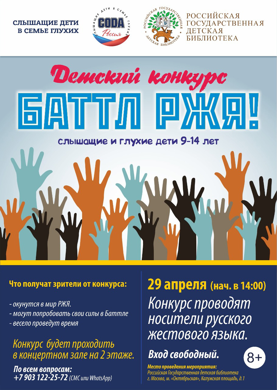 29 апреля в 14:00 в Российской государственной детской библиотеке (м. «Октябрьская», Калужская площадь, д.1, концертный зал, 2 этаж) состоится детский конкурс «Баттл РЖЯ» среди слышащих и глухих детей в возрасте от 9 до 14 лет.