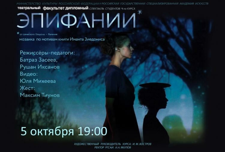 - 8 декабря в 19:00 и 15 декабря в 18:00 – «Эпифании», мозаика по мотивам книги Иманта Зиедониса.