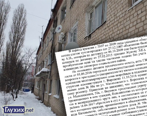 В октябре 2016 года специальная комиссия администрации г. Воронежа признала, что дом № 50а по ул. Малаховского подлежит капитальному ремонту. «Принимая во внимание, что техническое состояние здания по ул. Малаховского, 50а, г. Воронеж представляет угрозу жизни и здоровью как проживающих в нем граждан, большинство из которых являются инвалидами, так и неопределенного круга лиц, в соответствии со ст.45 ГПК РФ прокурор района 18.04.2017 обратился в суд с заявлением в защиту прав, свобод и законных интересов граждан, проживающих в общежитии, обязать Жукова Эдуарда Евгеньевича, собственника жилого дома № 50а по ул. Малаховского, г. Воронеж провести капитальный ремонт дома. Решение Коминтерновского районного суда от 26.09.2017 исковые требования удовлетворены», – сообщил порталу «Глухих.нет» заместитель прокурора района Новожилов А. А.