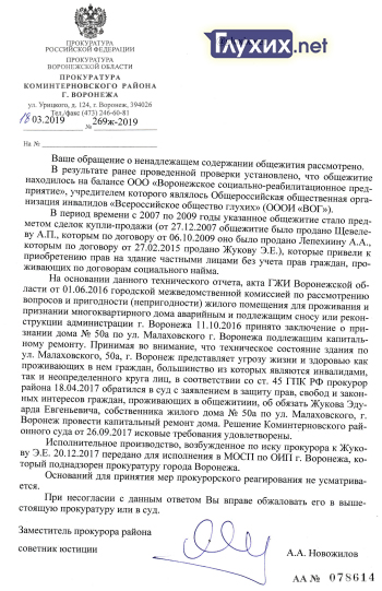 «Глухих.нет» направил запрос в прокуратуру города Воронежа с просьбой прокомментировать ситуацию с общежитием. В прокуратуре Коминтерновского района города Воронежа рассказали, что «в период времени с 2007 по 2009 годы указанное общежитие стало предметом сделок