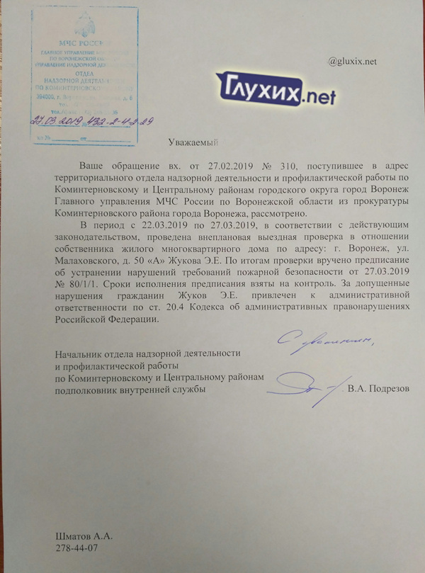 Как сообщил начальник отдела надзорной деятельности и профилактической работы по Коминтерновскому и Центральному районам, подполковник внутренней службы Подрезов В. А., по итогам проверки вручено предписание об устранении нарушений требований пожарной безопасности от 27.03.2019 № 80/1/1, а сроки исполнения предписания взяты на контроль. За допущенные нарушения гражданин Жуков Э. Е. привлечен к административной ответственности по ст. 20.4 Кодекса об административных правонарушениях Российской Федерации.