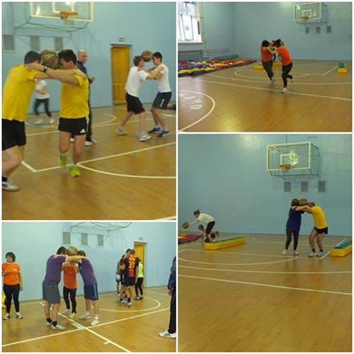 соревнования с мячом – и между ног его удержать, и между голов двух людей, и «каракатицей» его