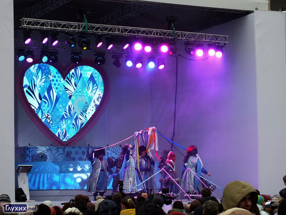 Перед появлением Паралимпийского Огня публику подогревали артисты в голубых нарядах с мехами.
