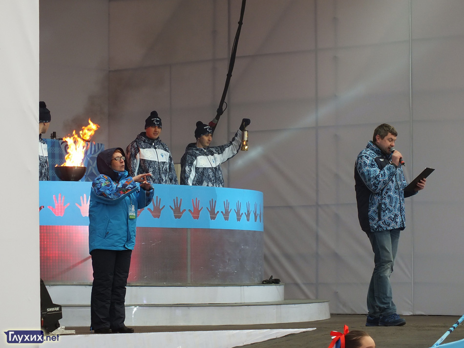 Организаторы подумали и о людях с нарушением слуха – для них работал переводчик ЖЯ. Видите изображения рук на голубом? В тот момент, когда дети прикоснулись рукой к ним, зажглись бенгальские свечи и сам Паралимпийский огонь.