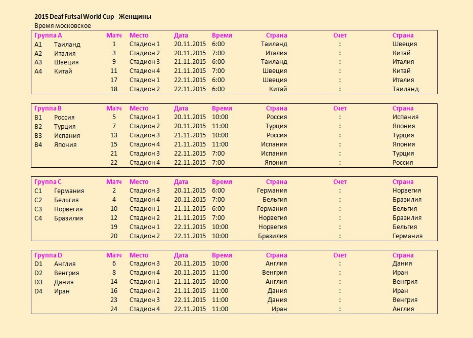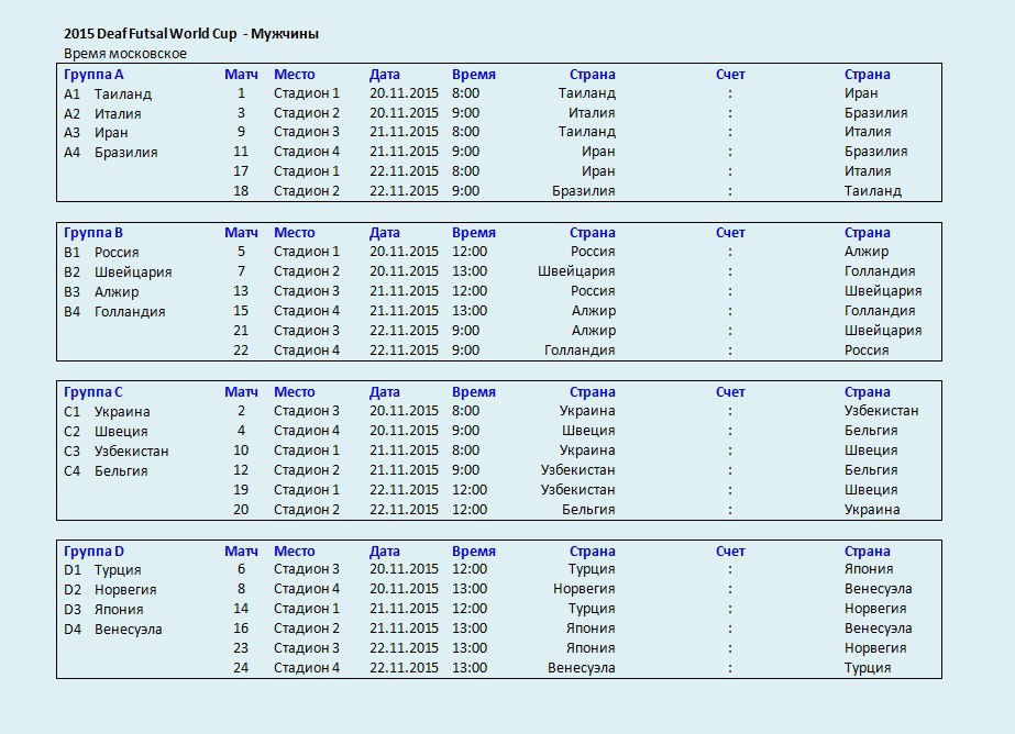 С 20 по 28 ноября в Бангкоке, пройдёт Чемпионат мира по футзалу среди мужских и женских глухих команд. Российская сборная сыграет против Швейцарии, Алжира и Голландии.