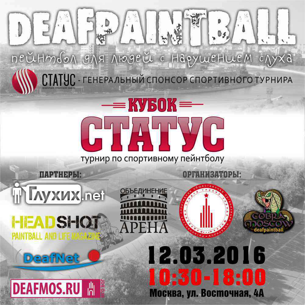12 марта 2016 года состоится спортивный турнир по пейнтболу среди инвалидов по слуху на традиционной площадке в пейнтбольном дворце «Арена». Генеральным спонсором данного турнира является МПО «Статус».