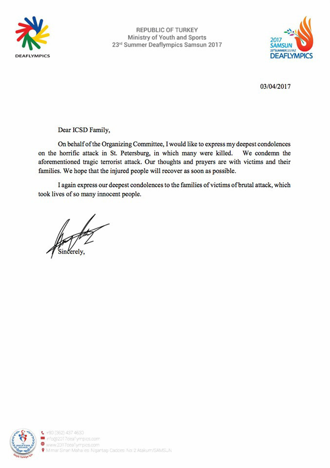 В связи с террористическим актом в петербургском метро, организаторы Сурдлимпийских летних игр – 2017 в Самсуне выпустили специальное письмо, в которой выразили «глубокие соболезнования» в связи с ужасным нападением в Санкт-Петербурге, где накануне произошёл теракт и погибли люди.