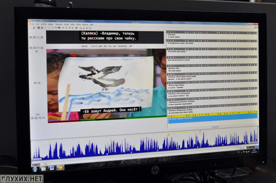 Антон: «Созданные субтитры, после проверки их корректности и содержания, попадают в специальную базу данных. Оператор эфирного комплекса, заполняя лист прохождения программ, предназначенных для эфира, отслеживает наличие субтитрированного материала и делает соответствующие пометки в расписании, чтобы в дальнейшем умная система прикрепила их к передаче. Основная нагрузка по созданию субтитров лежит на редакторском составе, остальные действия оборудование выполняет в автоматическом режиме с минимальным участием человека».