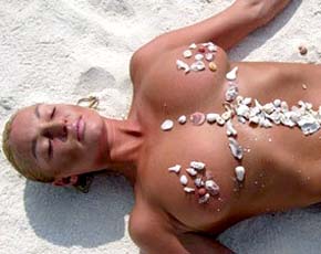 Вот она лежит у моря без одежды, прикрыв запретные места камушками и песком, а вот – топлесс моется в душе на пляже.